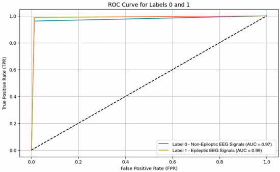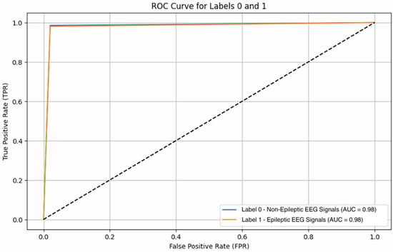 Visualization of the model’s performance based on the ROC curves shows that both label 0 (non-epileptic EEG signals) and label 1 (epileptic EEG signals) demonstrate high levels of performance, with area under the curve (AUC) values of 0.98 for both labels. This indicates that the model has excellent capability to distinguish between non-epileptic and epileptic EEG signals. A high AUC value close to 1.0 signifies that the model has a strong true positive rate while maintaining a low false positive rate, thus confirming its effectiveness and reliability in correctly identifying and differentiating the two classes. This robust performance is crucial for the precise detection and response to the occurrence of a seizure.