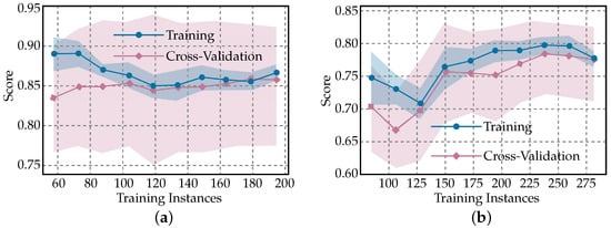 The comparison tables show the average score of each model across all folds and are seen in Table 1 and Table 2. The learning curves for the model trained in the 2C dataset (Figure 1a) provide a visual representation of the logistic regression’s performance as it learns from more data. The training curve, which starts above the cross-validation curve, represents the model’s performance on the training data. The cross-validation curve, which rises gradually and eventually plateaus, represents the model’s performance on unseen data. At the start of training, the model performs well on the training data but not as well on the unseen data, hence the training curve is above the cross-validation curve. As the model is exposed to more training instances, it begins to generalize better to unseen data, which is reflected in the rising cross-validation curve. The point where the training curve meets the cross-validation curve is significant. This point of convergence indicates that the model has reached a state where it performs similarly on both the training and validation data. This is typically the point where the model has learned to generalize well and is neither overfitting (performing significantly better on the training data than on the validation data) nor underfitting (performing poorly on both the training and validation data).