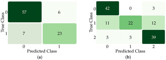 The confusion matrix for the model for the (a) 2C dataset (where 0: normal, 1: abnormal), and (b) 3C dataset (where 0: normal, 1: disc hernia, 2: spondylolisthesis).