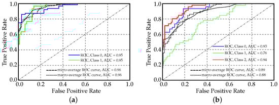 The AUC curve for the model for the (a) 2C dataset, and (b) 3C dataset.