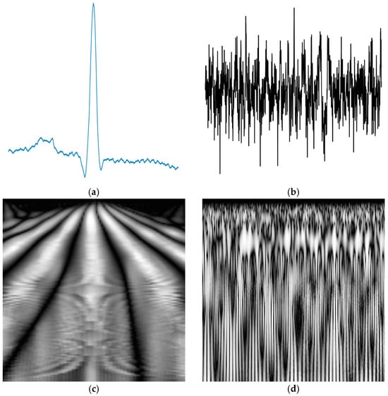 A typical normal (a) ECG signal and (b) EEG signal; (c) the corresponding transformed CWT image of the ECG signal and (d) the corresponding transformed CWT image of the EEG signal.