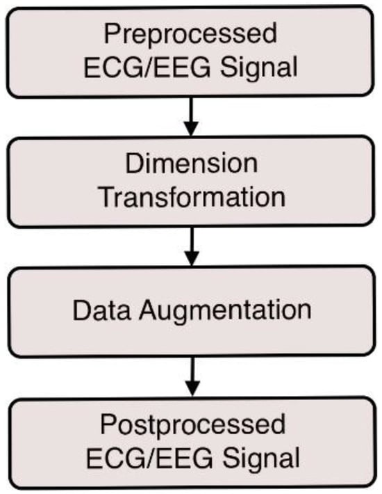 Preprocessing the ECG and EEG signals is a crucial process to enhance signal quality and reliability before transforming them into 2D images. By cleaning and standardizing the data, preprocessing ensures that the 1D-to-2D transformations are capable of producing images to accurately represent the underlying physiological signals [35]. The preprocessing steps for both types of signals are illustrated in Figure 1.
