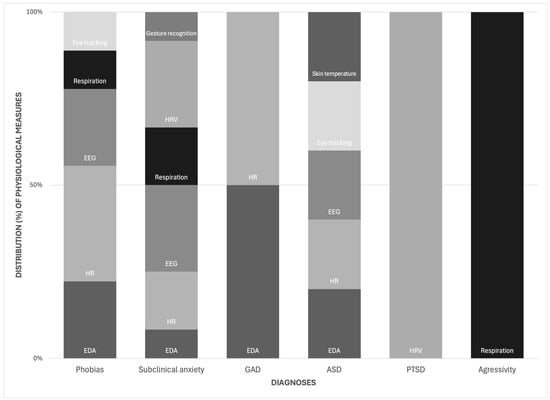 Distribution of physiological measures across diagnoses. EDA and HR are most frequently employed across disorders, while measures such as HRV, respiration, skin temperature, gesture recognition, and eye tracking are less common and concentrated in specific conditions.