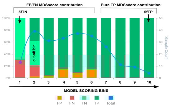 An illustrative example of an MSDA plot. False positives (FP), false negatives (FN), true positives (TP), true negatives (TN) and total observations (Total) per each score bin are highlighted by different colours, depicted below in the figure legend. The left vertical axis represents the percentages of TP, TN, FP, and FN in each bin score, whereas the right axis represents the total observation counts of each bin. The x-axis depicts the bins of intervals of the model scores for phenotype classification. The bin values on the x-axis indicate the highest value of each bin interval of values (e.g., 0–1, 1–2, 2–3, 3–4, …). Components of the MSDscore (Equation (2)) are depicted at the top. The arrows depict the 5fTN and 5fTP members of Equation (2), whereas the grey brackets indicate the bin score regions associated with the remaining members of Equation (2).