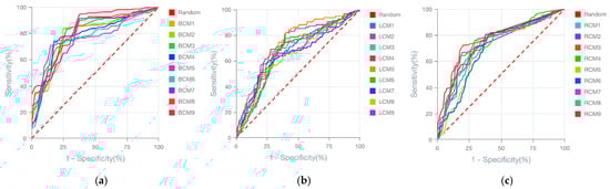 ROC curves of the 27 generated models for predicting cancer prognostics. (a) ROC of the breast cancer prognostic models. (b) ROC of the lung cancer prognostic models. (c) ROC of the renal cancer prognostic models. Model names are depicted in the figure legends. The dashed red line indicates the ROC threshold of prediction outcome generated by chance, whereas the continuous lines indicate the model ROC behaviour.