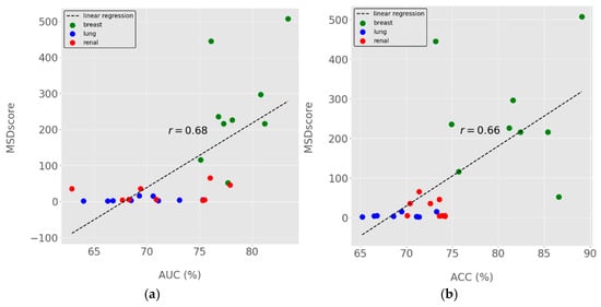 MSDscores relation with standard performance metrics for model selection. (a) MSDscores as a function of ROC Area-Under-the-Curve (AUC). (b) MSDscores as a function of accuracy. Dots represent the computed performance metrics for all 27 models generated for breast, lung and renal cancer prognostics. Dots in different colours represent data from distinct cancer types, as indicated in the figure legend. The linear regression trendline is shown in dashed lines, and the computed Pearson’s correlation coefficients (r) are highlighted in the centre of the figures (a,b) near the trendline.
