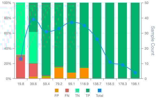 The MSDA methodology consists of the analysis of the distribution of true positives (TP), true negatives (TN), false positives (FP), and false negatives (FN) across the scoring space generated by a predictive model for a given phenotype classification. The method uses the interval of the values obtained from the predictive scores generated by the feature scoring mathematical model that enables phenotype classification (once the model cutoff value is applied). The analysis is performed using the prediction scores obtained from the entire dataset used for validation of the model. The model’s score range is discretised into ten equal-width intervals (bins), ordered from the lowest to the highest score values. For each bin, the number of TP, TN, FP, and FN is computed. This approach enables the examination of how prediction outcomes are distributed along the score space and allows testing of the hypothesis that increasing prediction scores correspond to a higher likelihood of a phenotype classification. Ten bins were defined to achieve a suitable balance between granularity and interpretability. These were considered to provide scaling of scores in factors of 10 and facilitate visual comparisons between models, mimicking standard normalisations. The binning in this manner allows for the identification of local regions within the score space that demonstrate distinct degrees of predictive performance. Each bin can therefore be interpreted as a local performance unit, revealing zones of confident or uncertain model behaviour. A graphical representation of the score-bin distribution (MSDA plot) was generated to allow intuitive comparison between models, especially in cases where global metrics such as AUC, sensitivity, specificity, and accuracy show little variation. The visualisation consists of a stacked bar chart displaying the TP, TN, FP, and FN counts across the model phenotype scoring bins, alongside a line plot showing the total number of cases per bin (see Figure 1).