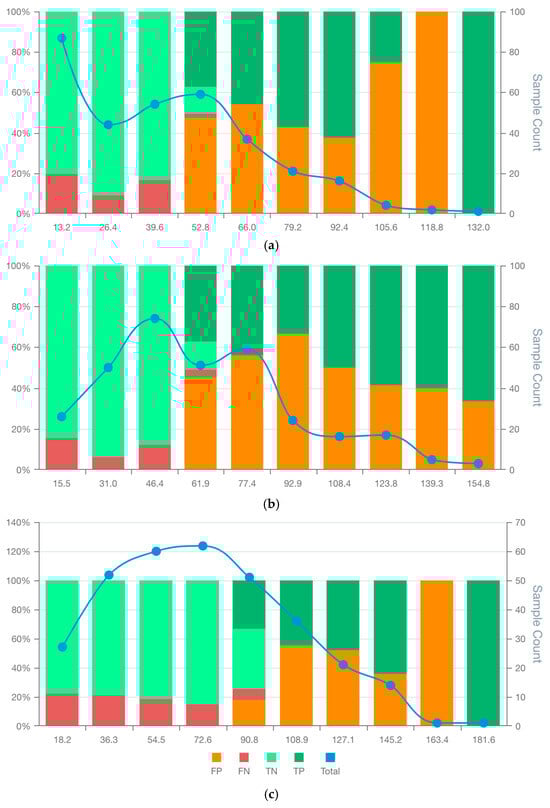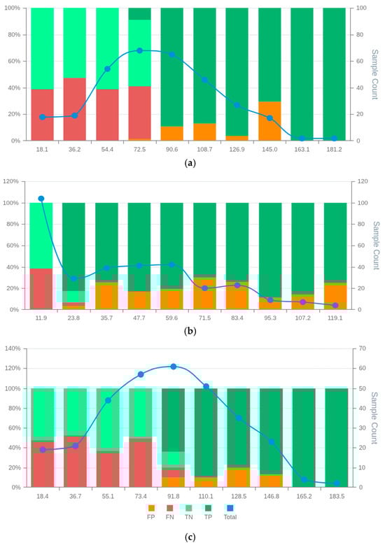 MSDA plots of the bespoke candidate model for lung cancer prognostics: LCM3 (a) LCM5 (b), and LCM9 (c). False positives (FP), false negatives (FN), true positives (TP), true negatives (TN) and total observations (Total) per each score bin are highlighted by different colours, depicted below in the figure legend. The left vertical axis represents the percentages of TP, TN, FP, and FN in each bin score, whereas the right axis represents the total observation counts of each bin. Numerical values shown for each bin represent the end interval of the bin.