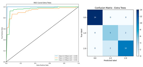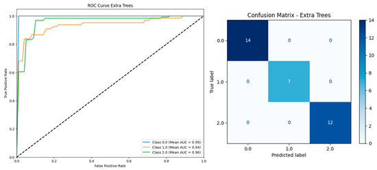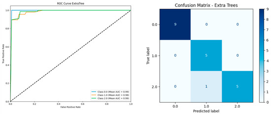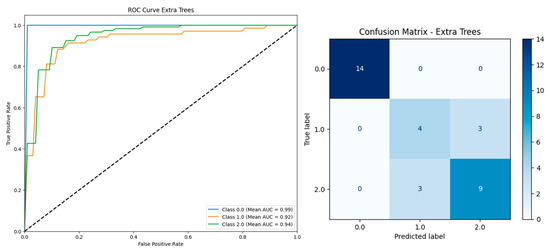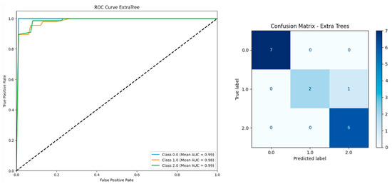 Figure 12, the ROC curve (left) shows that the Extra Trees model achieved strong classification performance, with AUC values of 0.99 for Class 0, 0.92 for Class 1, and 0.94 for Class 2. The confusion matrix (right) confirms high accuracy, correctly classifying most instances, with only a few misclassifications between Classes 1 and 2. These results demonstrate the model’s robustness and reliability after feature reduction.