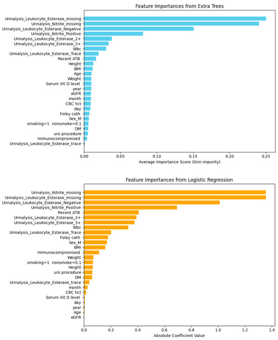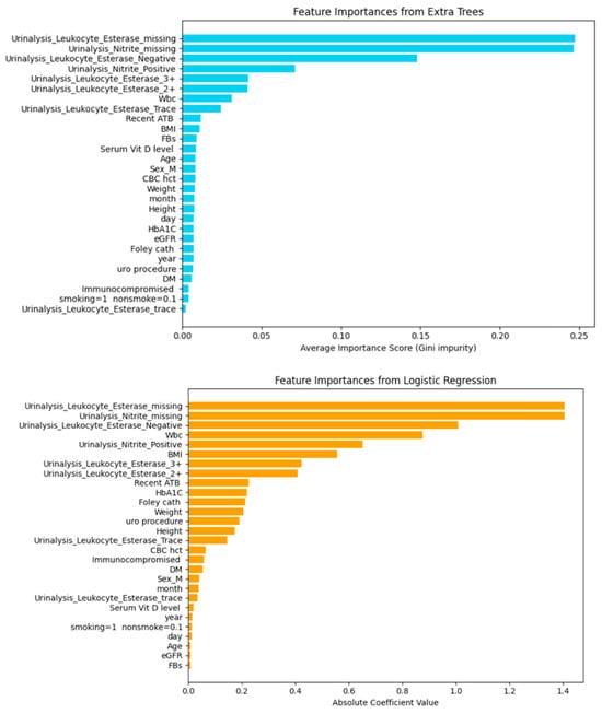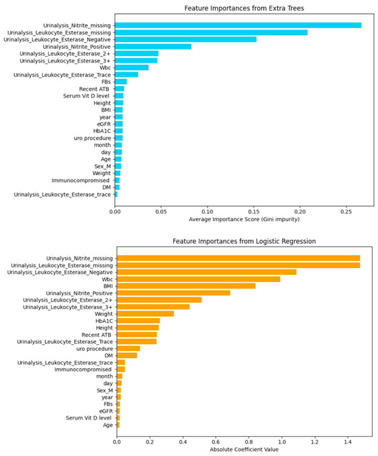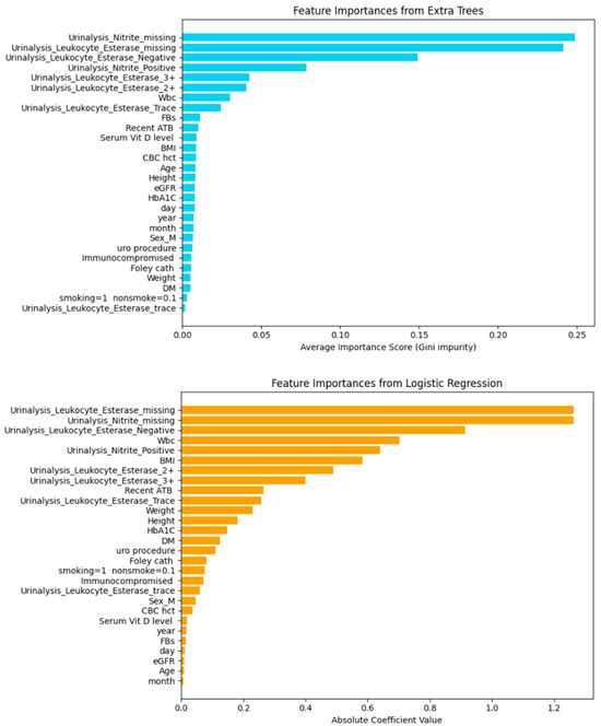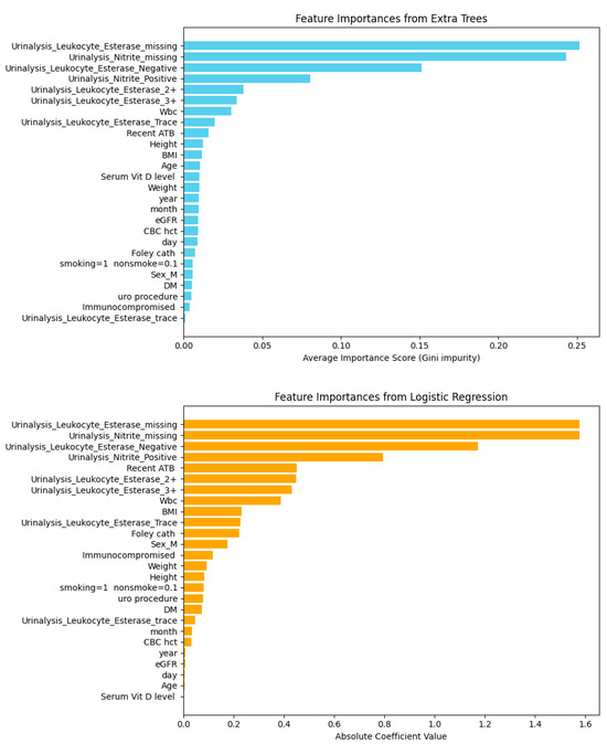 Feature importance was evaluated using Logistic Regression (coefficients) and Extra Trees (Gini impurity). Both methods consistently ranked urinalysis parameters—particularly leukocyte esterase and nitrite, including their missing values—as the strongest predictors. Their consistent prominence across linear and ensemble models highlights the robustness of these features in classifying the target outcome.