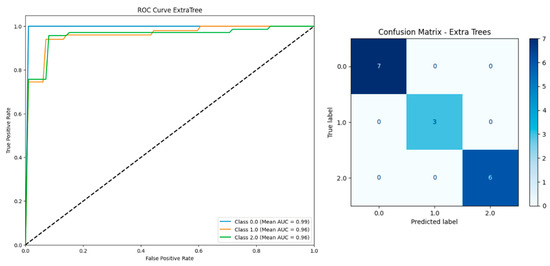 Figure 6, based on the ROC curve and confusion matrix of the Extra Trees model after the removal of low-correlation features, the model maintained high predictive performance. The AUC values for each class ranged between 0.96 and 0.99, indicating excellent discriminative ability. The confusion matrix further demonstrates that the model accurately classified most cases across all groups, with no misclassifications between class 0 and class 2. Notably, class 1 was perfectly predicted with all three instances correctly identified. These results highlight the robustness and reliability of the Extra Trees model following feature selection.