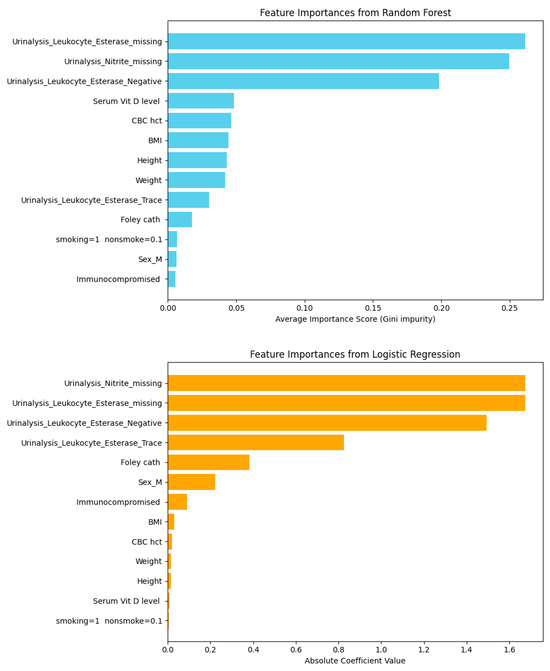 Figure 9, both models consistently highlighted Urinalysis Leukocyte Esterase missing and Urinalysis Nitrite missing as the most influential predictors, underscoring the diagnostic value of missing urine dipstick results. In contrast, serum vitamin D level ranked among the least important features, suggesting a limited role in prediction compared with urinalysis parameters.