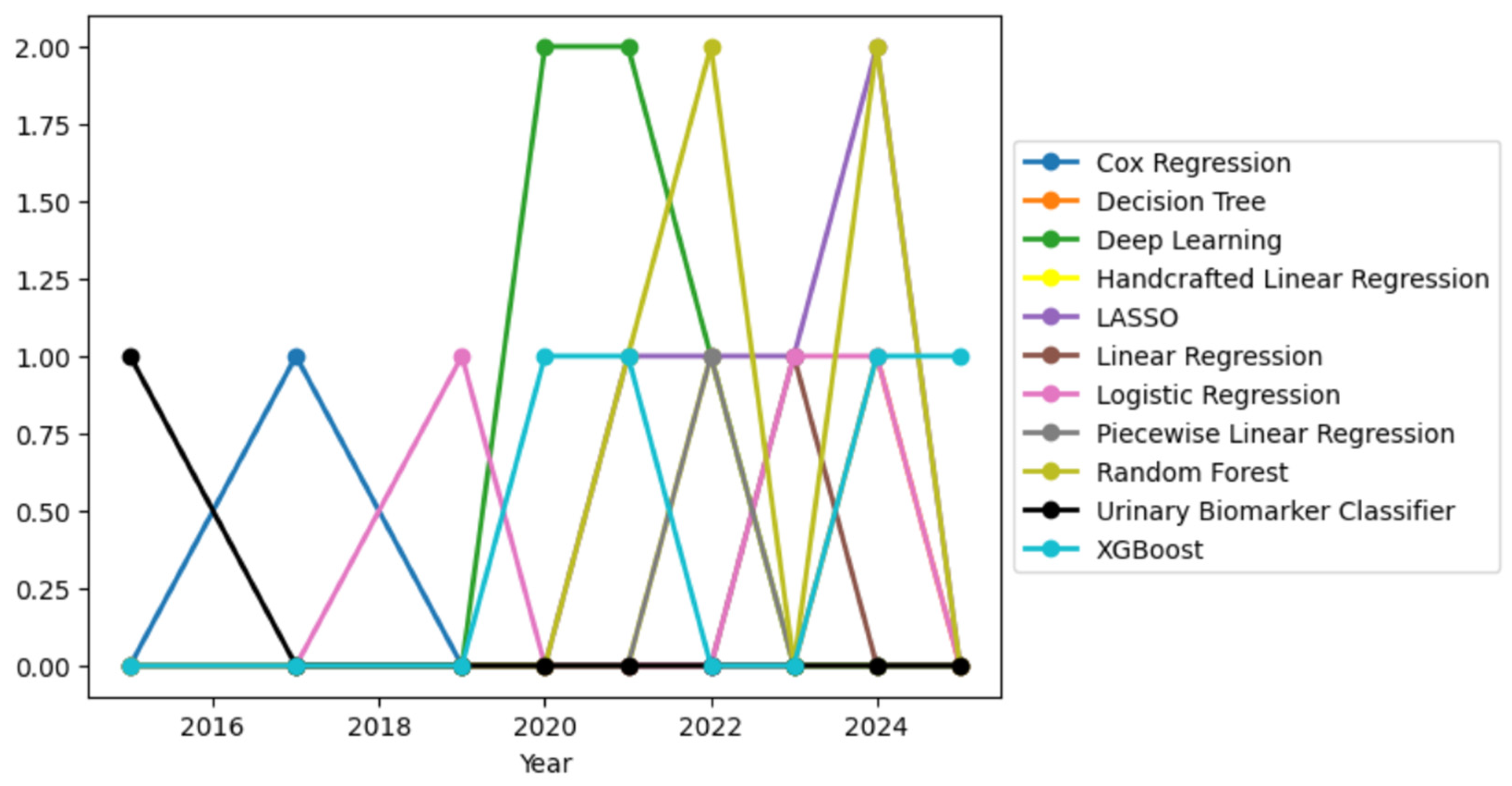 40] developed an ML-based CVD risk prediction model in a cohort of 8894 CKD patients from a single Chinese center. The XGBoost model delivered strong discrimination (AUC ≈ 0.89 in test data) and was made interpretable via SHAP.