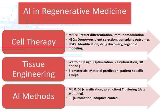 Artificial intelligence (AI) plays a crucial role in regenerative medicine, particularly in cell therapy. This includes the use of mesenchymal stem cells (MSCs), hematopoietic stem cells (HSCs), and induced pluripotent stem cells (iPSCs). AI is also involved in tissue engineering, as well as the design of scaffolds and biomaterials. Various AI methods, such as machine learning (ML), deep learning (DL), clustering, and reinforcement learning (RL), are utilized in these processes.
