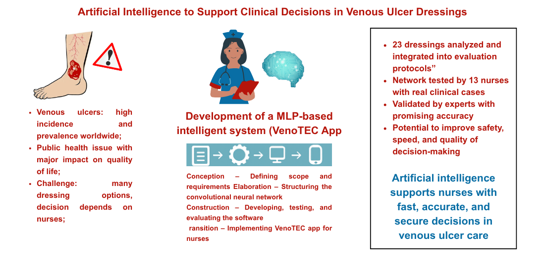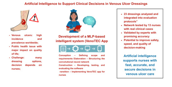 However, there are significant differences in architecture, production method, and execution. The intelligent software developed, VenoTEC, originates from a systematic production process based on critical literature review and structured as a ANN trained with scientific evidence, expert opinions on venous ulcer treatment, and validated protocols to select the appropriate dressing for each wound [