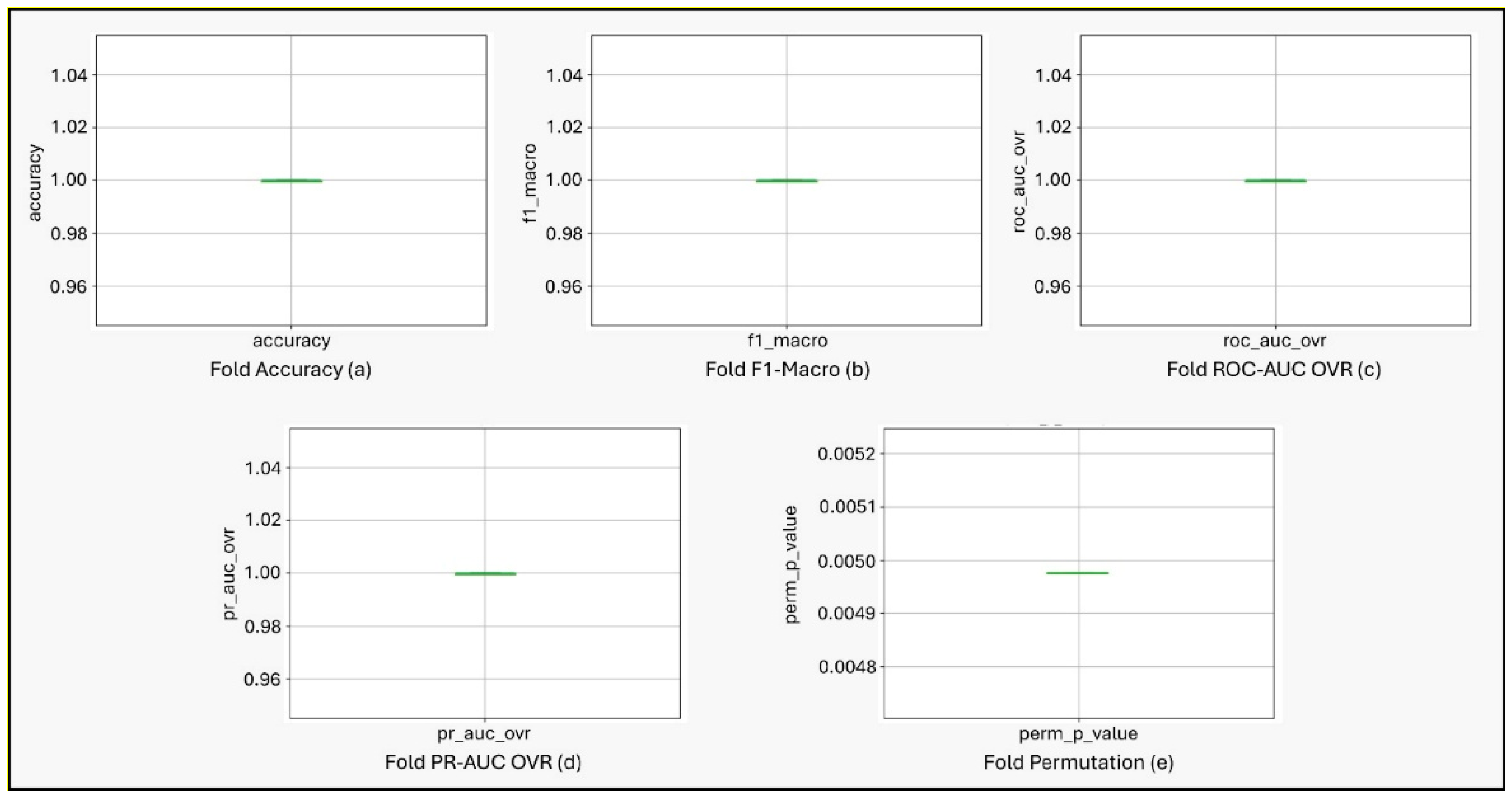 Table 3 demonstrate that all models achieved identical performance: mean Accuracy = 1.0, F1-macro = 1.0, and ROC-AUC = 1.0 for those capable of probabilistic output. The permutation test (