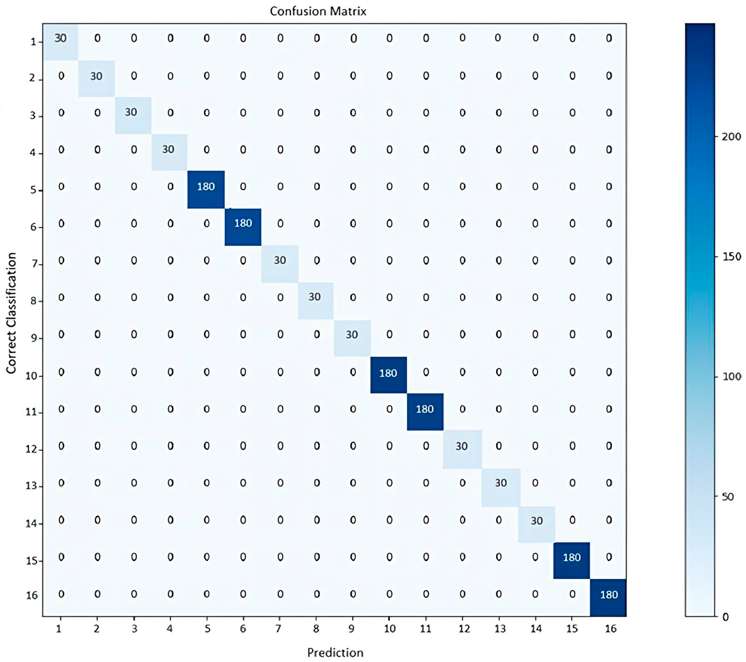Figure 4 presents the confusion matrix for one of the cross-validation folds as a representative example. The main diagonal shows that all 16 classes were classified correctly, without any errors, corroborating the model’s 100% accuracy.