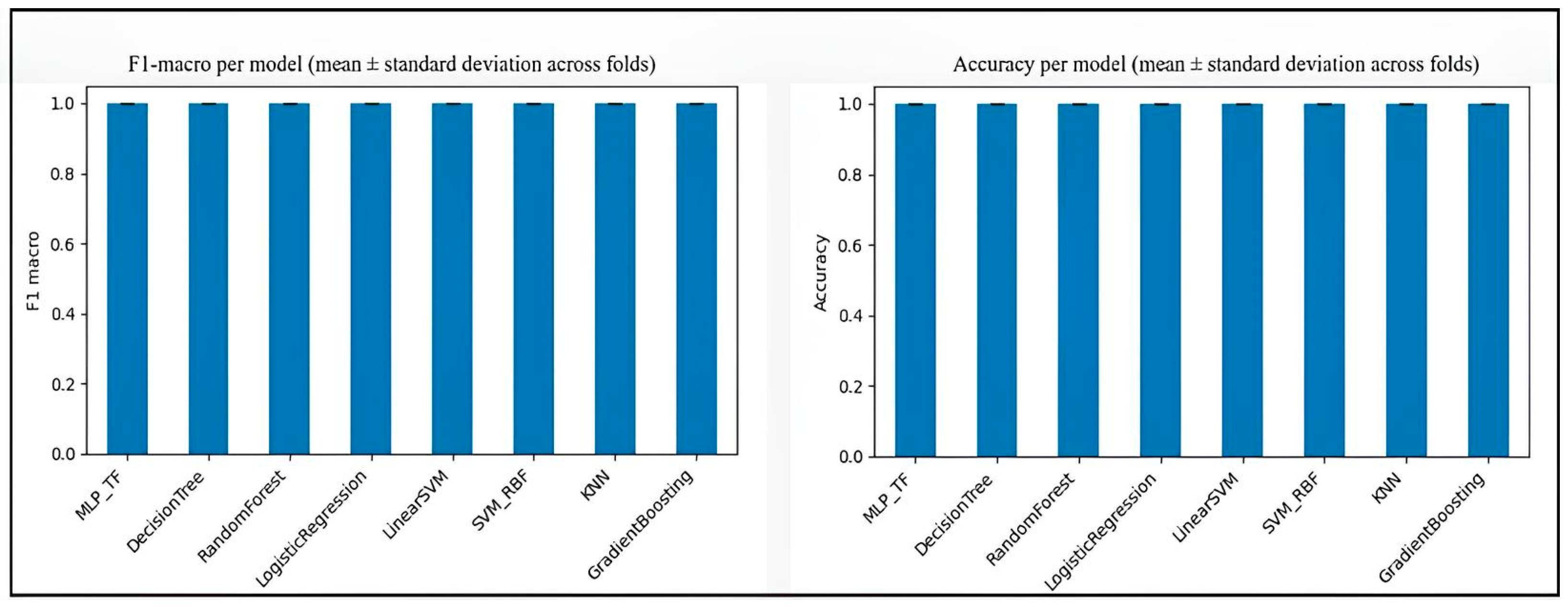 Table 3 demonstrate that all algorithms achieved perfect and identical performance metrics across folds. This outcome indicates that the predictive variables are highly informative, leading to a well-conditioned and nearly deterministic problem. The clear separation of classes explains why models of different families, including linear, neighbor-based, ensemble, and neural, converged to the same optimal accuracy.
