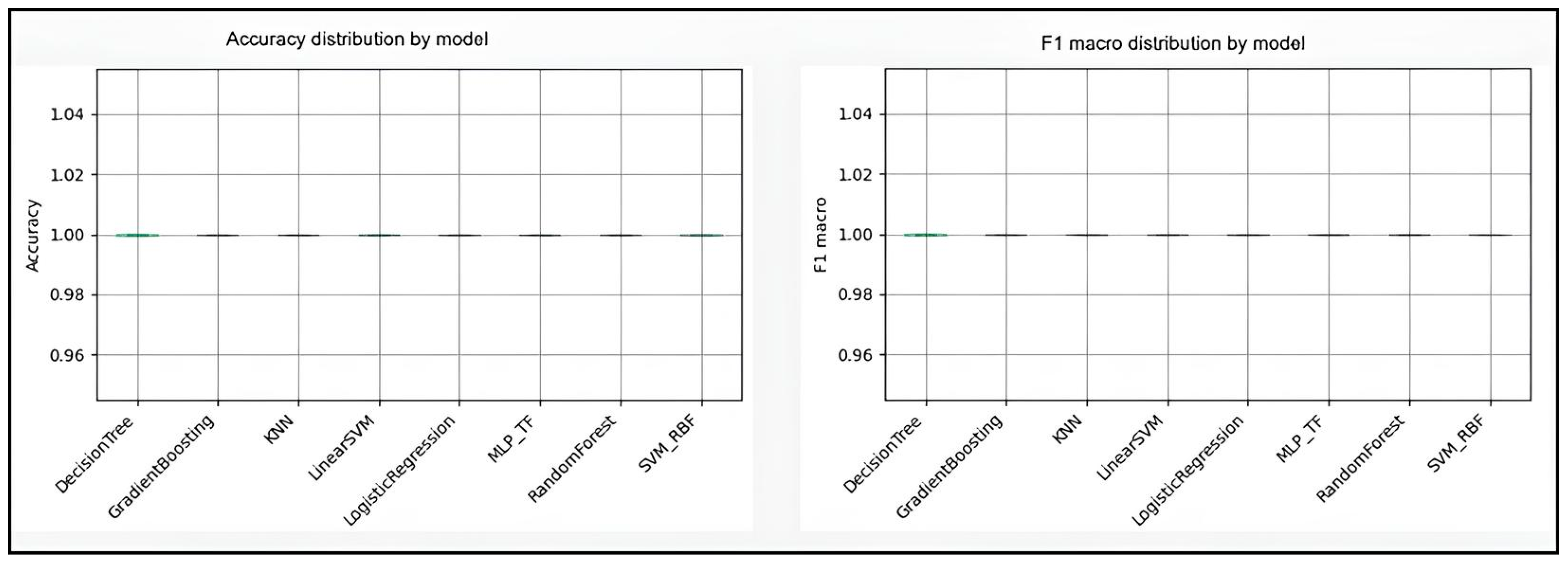 Figure 3. The boxplots demonstrate that the accuracy (a), F1-macro (b), ROC-AUC OVR (c), and PR-AUC OVR (d) metrics did not show any variation, remaining consistently at 1.0, which reinforces the robustness of the results.