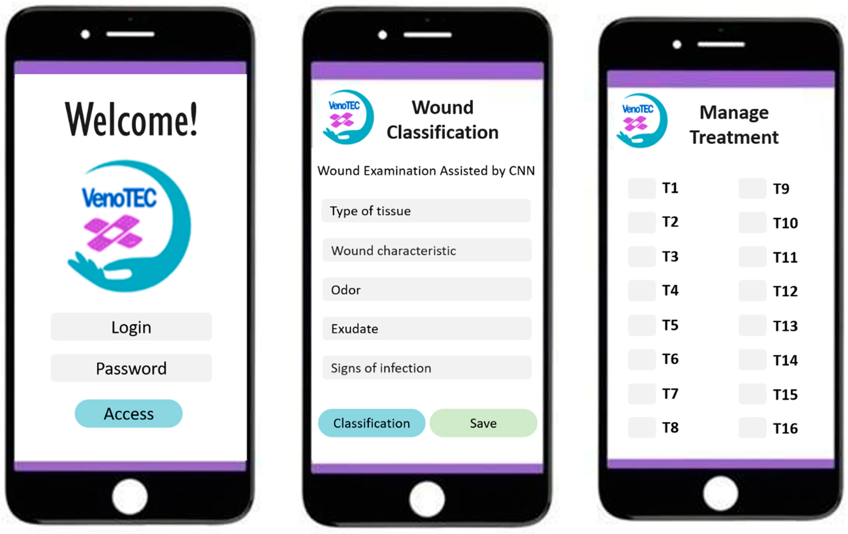 For the use of the neural network by healthcare professionals, it was necessary to build the application named VenoTEC. The app contains nine screens that display: welcome information; professional identification (login and password); patient registration with personal information, medical history, physical examination, wound assessment (type, edges, exudate, odor, pain intensity, pruritus) and the wound image with tissue classification. At this stage, the nurse can upload the saved photo to the system, input the wound characteristics, and by clicking on “classify,” a number will appear, with options for coverings, organized into 16 treatment groups. Below are some screens of the VenoTEC app (