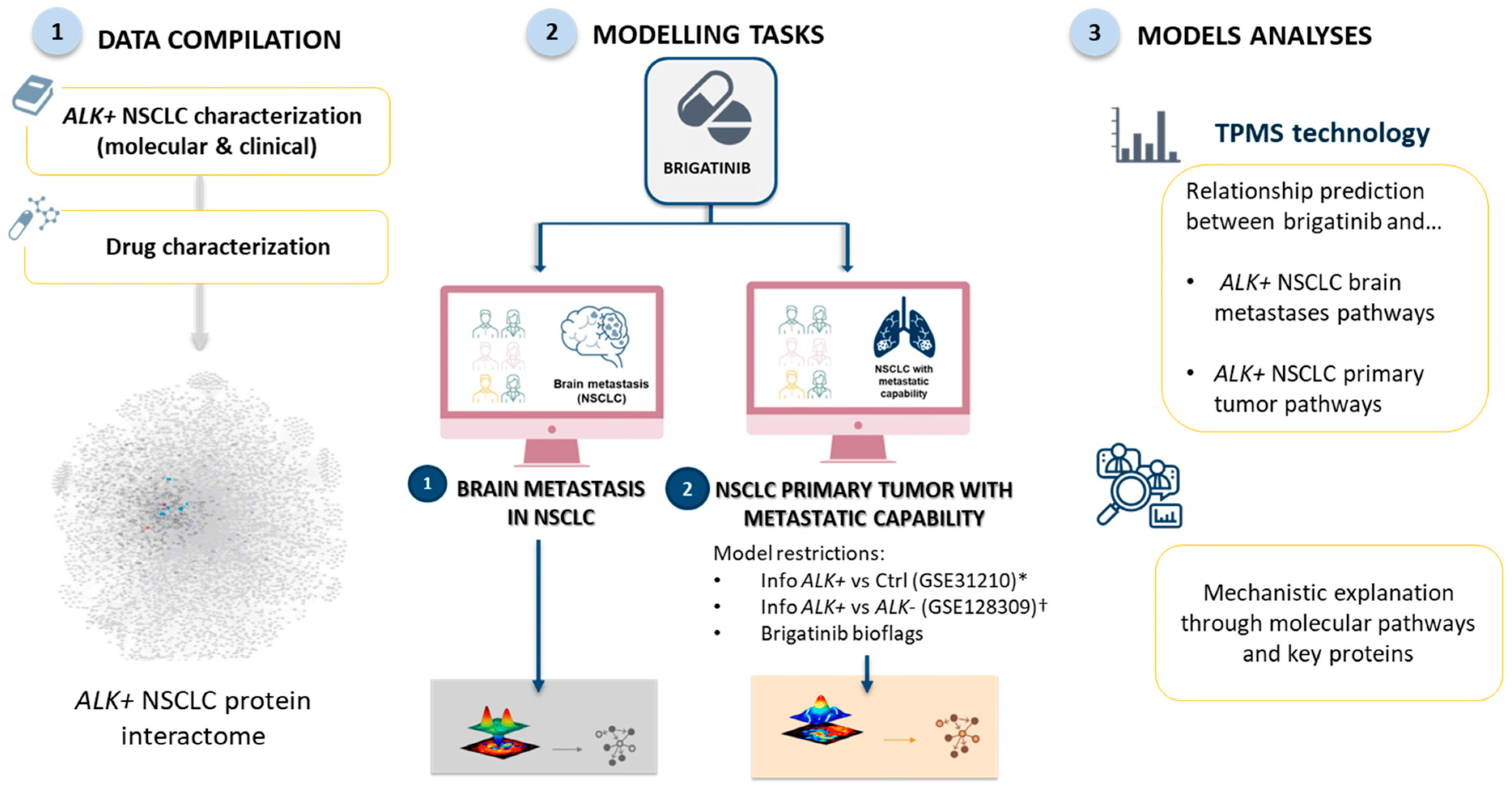 - Carcereny, E.; Fernandez-Nistal, A.; Lopez, A.; Montoto, C.; Naves, A.; Segu-Verges, C.; Coma, M.; Jorba, G.; Oliva, B.; Mas, J.M. Head to head evaluation of second generation ALK inhibitors brigatinib and alectinib as first-line treatment for ALK+ NSCLC using an in silico systems biology-based approach. Oncotarget 2021, 12, 316–332. [Google Scholar] [CrossRef] [PubMed]