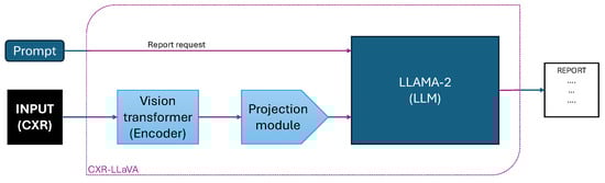 The development of deep learning for creating chest X-ray reports has seen significant progress lately. It is largely due to vision–language models that simultaneously analyze images and generate reports. These are essentially computer vision systems combined with advanced natural language processing techniques that are able to understand the X-ray images and generate their clinical report to ensure it closely mimics the radiologist’s workflow [6,7]. Advanced approaches have been developed recently, such as transformer-based architectures [8], contrastive vision-text learning [9,10,11], models enhanced with medical knowledge bases [12], memory-enhanced models [13], anatomically and expert-guided models [14,15], and Multi-View and longitudinally guided models [16].