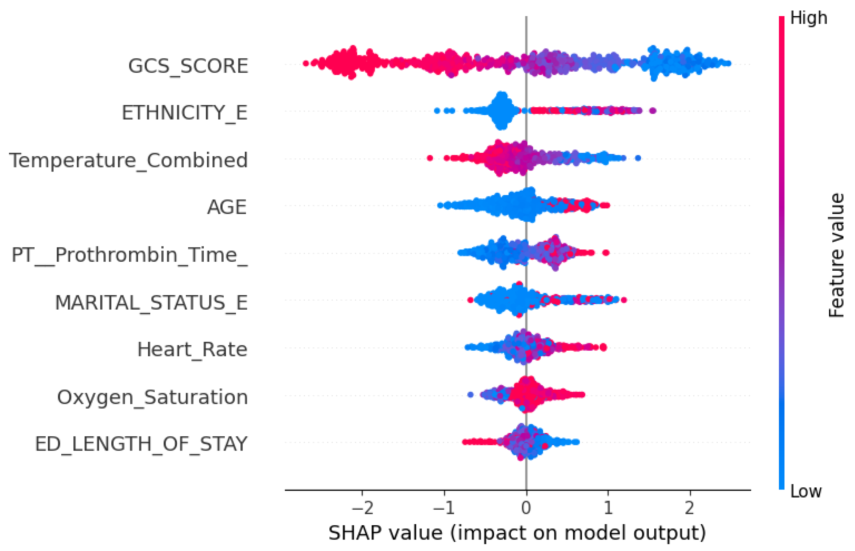 - Interpretability and Clinical Integration: To ensure clinical transparency and utility, SHAP (SHapley Additive exPlanations) analysis was applied to interpret the feature contributions. Key predictors such as GCS score, oxygen saturation, and prothrombin time were identified as major contributors to the model’s predictions, providing actionable insights for clinicians.