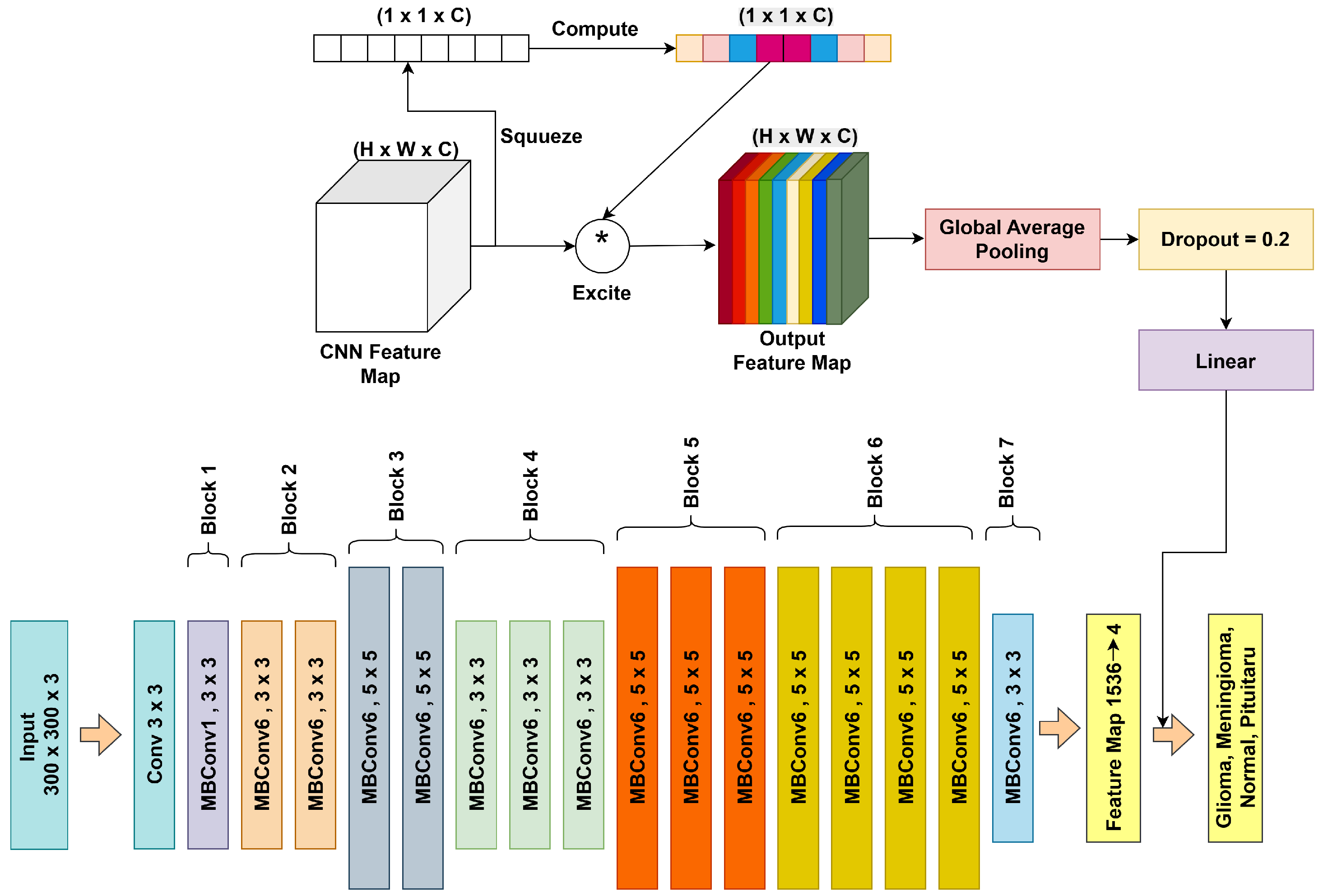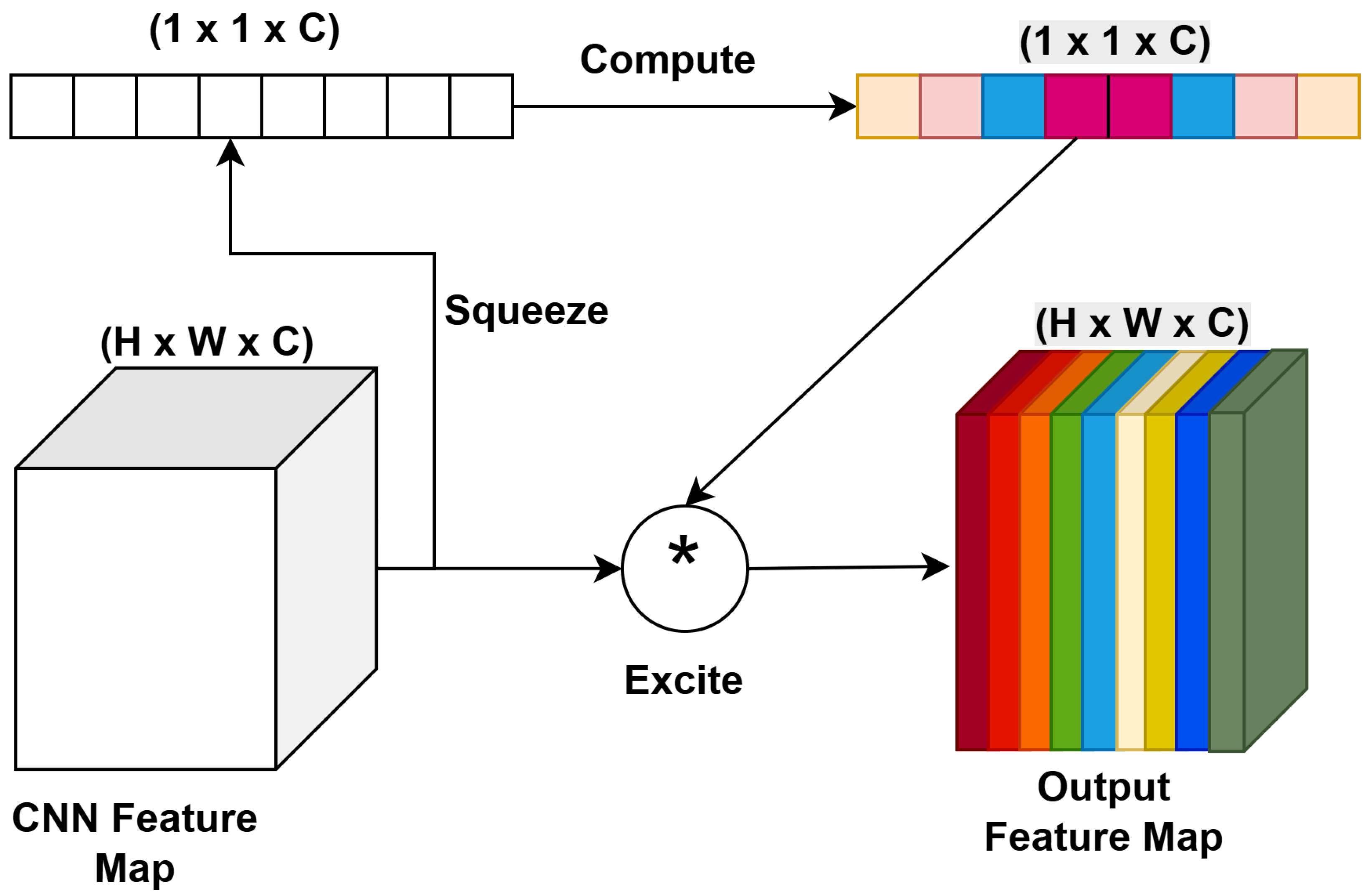 - Several baseline convolutional neural network architectures, including VGG19, DenseNet201, MobileNetV3-Large, InceptionV3, and EfficientNetB3, are enhanced using squeeze-and-excitation attention modules to improve channel-wise feature representation.