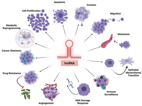 The superfamily of lncRNAs consists of more than 70,000 annotated lncRNAs in the human genome [22]. Functionally, lncRNAs can be defined as the multifunctional regulators of gene expression. Aberrant expression of lncRNAs and the resultant dysregulated expression of oncogenes and tumor-suppressor genes are associated with tumorigenesis and tumor progression. The mechanisms by which lncRNAs execute their oncogenic function involve the modulation of gene expressions through cis- and trans-modes of epigenetic regulation, the regulation of chromatin topology, serving as RNA decoys, acting as scaffolds for proteins and RNAs, and sequestering microRNAs (miRNAs) by acting as competing endogenous RNAs (ceRNAs) [21,22,23,24,25]. They also play significant roles in enhancing the expression of neighboring genes [18]. Through their various modes of action, lncRNAs contribute to several oncogenic processes. These include cell proliferation, genomic instability, invasive migration, epithelial-to-mesenchymal transition (EMT), stem cell differentiation, maintenance of pluripotency, tumor progression and suppression, DNA damage response and repair, and metabolic reprogramming [19,26,27,28,29,30,31,32,33,34,35,36,37,38,39,40,41,42,43,44].