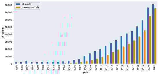 Pubmed Central (PMC) publication results on search for “open data cancer” per year, comparing the number of all results and filtered by open access.