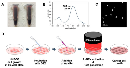 (A) PEGylated AuNRs solution utilized in Laser-Activated Nanotherapy (LANT); (B) UV-VIS-NIR spectrum of AuNRs showing an 808 nm absorption peak and (C) scanning transmission electron microscope (STEM) image of AuNRs having 40 nm in length, 10 nm in width, and aspect ratio (R = 4), with up to six-month stability; and (D) schematic illustration of DTX and LANT combination treatment in vitro. The illustration demonstrates one well of a 96-well plate.