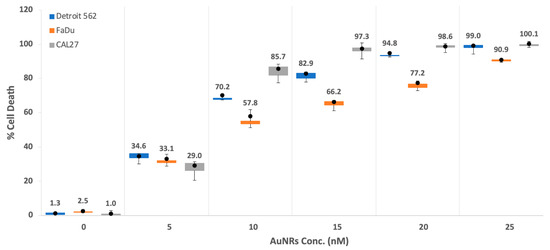 Box and Whisker plot to display LANT monotreatment dose-response with AuNRs concentration for HNSCC cell lines: Detroit 562 (blue box), FaDu (orange box), and CAL 27 (gray box) at concentrations of 0, 5, 10, 20, and 25 nM; 25 μL of AuNRs per well, with and without 808 nm NIR activation for 4 min at 1.875 W/cm2. Dots show the mean values of n = 6.