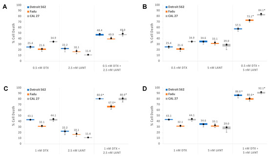 According to our previously established methods, the LMM regression post hoc test compared the means of the six DTX and LANT monotreatments versus combination treatment groups for all three HNSCC cell lines [42]. These post hoc analyses are summarized in Table 3, showing statistically significant differences (p < 0.05) in the means for most of the comparison groups. DTX and LANT treatment combinations were, in general, significantly more effective than the corresponding DTX monotreatments. In this study, the best-performing treatment regimen combined 1 nM DTX + 5 nM LANT, with approximately an 86.6%, 80.6%, and 92.1% increase in cell death versus 1 nM DTX alone for Detroit 562, FaDu, and CAL 27 cells, respectively. The other treatment combinations also induced significantly more cell death than 0.5 or 1 nM DTX alone. There were two comparisons (of 15 comparisons) for Detroit 562 and CAL 27 and 1 comparison for FaDu that did not reach statistical significance (Table 3). The LANT monotreatment was omitted from this comparison because we previously showed that the effective LANT monotreatment dose significantly induced tumor regression by approximately 100% (p < 0.0001) with no observed toxicity or side effects [39].