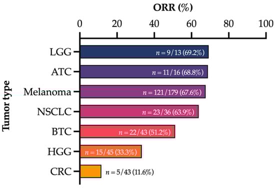 Data from Subbiah et al. [24], Long et al. [25], Planchard et al. [26], Subbiah et al. [27], Subbiah et al. [28] and Corcoran et al. [29]. ATC—anaplastic thyroid cancer; BTC—biliary tract cancer; CRC—colorectal cancer; HGG—high-grade glioma; LGG—low-grade glioma; NSCLC—non-small cell lung cancer.