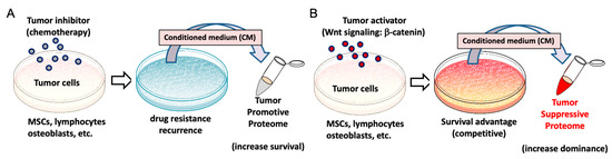 Comparison of the tumor-promotive secretome with the tumor-suppressive secretome. (A) Tumor cells induce the tumor-promotive secretome in response to a chemotherapeutic inhibitor to tumorigenic signalings, such as Wnt signaling, PI3K signaling, EMT induction, and PKA signaling [29,30]. Non-tumor cells (e.g., MSCs, lymphocytes, and osteoblasts, etc.) can also be used instead of tumor cells to produce a conditioned medium. (B) Tumor cells (and non-tumor cells, such as MSCs, lymphocytes, and osteoblasts, etc.) induce the tumor-suppressive secretome in response to an activator (e.g., the overexpression of β-catenin in Wnt signaling and the overexpression of Akt in PI3K signaling [29,30] to tumorigenic signaling).