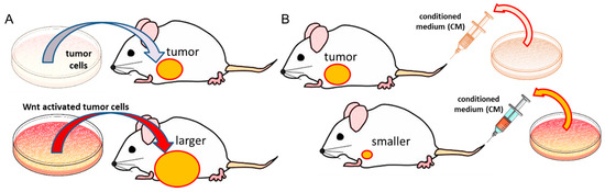 Counterintuitive reduction in mammary tumors by the administration of a Wnt-activated tumor cell-derived conditioned medium. (A) The inoculation of Wnt-activated tumor cells induces a larger mammary tumor than that of control tumor cells. (B) The administration of a Wnt-activated tumor cell-derived conditioned medium suppresses the growth of mammary tumors. In the study by Liu et al. [29], it is found that Lrp5-overexpressing osteocyte-derived conditioned medium significantly reduced the progression of mammary tumors as well as the destruction of the tumor-invaded tibia in a mouse model of breast cancer and bone metastasis. It is also reported by Sun et al. [30] that Akt-overexpressing MSC-derived conditioned medium inhibited the growth of mammary tumors and bone loss in the tumor-colonized tibia in a mouse model.