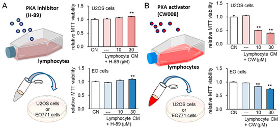 Figure 3 presents one example of inducing tumor-suppressive secretomes from T lymphocytes. In this example, Jurkat T-lymphocytes [43] were treated with a protein kinase A [44] (PKA) inhibitor, H-89 [45], as well as a PKA activator, CW008 [46]. One day after the incubation, lymphocytes were rinsed and the culture medium was replaced with a fresh one. The conditioned medium was collected after one-day incubation and they were given to U2OS human osteosarcoma [47] and EO771 mammary tumor cells [48]. The MTT-based metabolic activity, which indicates cell viability, was elevated by PKA inhibitor-treated CM and reduced by PKA activator-treated CM. This example supports the counterintuitive approach in which the tumor-suppressive secretomes were obtained by the activation of PKA signaling.