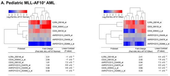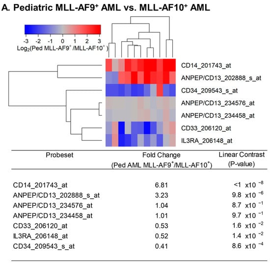 Our analyses of AML primarily focused on the expression levels of the CD13, CD33, and CD34 genes, used as AML-associated markers, and IL3RA/CD123. We also performed focused gene expression analyses comparing primary leukemic blasts from MLL-AF9+ AML versus either MLL-AF10+ AML or MLL-AF6+ AML patients, interrogating the following control genes: CD13, CD14, CD33, and CD34, in addition to the following receptors for cytokines: CSF3R, KIT, CSF1R, IL2RA, IL6R, FLT3, IL1R1, CSF2RB, IL5RA, CSF2RA, and IL3RA. Our analyses of ALL focused on the expression levels of CD19 and CD34 genes, used as markers, and IL3RA/CD123. Mixed Model ANOVAs implemented in R version 4.1.2 (1 November 2021) were run in the RStudio 2021.09.0 Build 351 environment, as previously described [37,38]. We investigated differential gene expression levels in leukemia cells from MLL-R+ subsets of high-risk acute leukemias vs. leukemia cells from MLL-R− subsets. The gene expression levels in leukemia cells from a specified subset were compared to the gene expression levels in normal hematopoietic cells, as well as the gene expression levels in leukemia cells from other subsets of leukemia patients, and the corresponding fold differences in expression were determined. The statistical model (built using lmerTest_3.1-3 and lme4_1.1-27.1 statistical packages implemented in Rstudio) controlled for variation caused by 2 fixed factors: “probeset” and “diagnostic group”. The variation caused by the interaction term, “probeset × diagnostic group”, was used to calculate least square means and standard error values to compare high-risk subsets of acute leukemia to the reference samples (normal or other). Gene-chip-to-gene-chip variation was accounted for by the random factor optimized utilizing the REML criterion (fits a variance-component model by residual (or restricted) maximum likelihood). The error term calculated for the interaction term was utilized to calculate statistical significance for comparison groups for each probeset using emmeans_1.7.0 and lsmeans_2.30-0 statistical packages. Differences with p-values less than 0.05 were deemed significant.