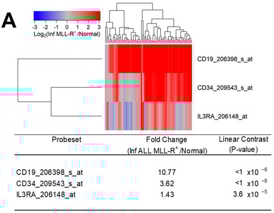 Amplified expression of IL3RA/CD123 in primary leukemic blasts from infants with MLL-R+ ALL. We examined the gene expression data in the archived data infant ALL dataset GSE68720 and the control dataset from GSE13159. The cluster figures display the expression levels in MLL-R+ ALL cells mean-centered to the reference group (normal hematopoietic cells from control bone marrow samples or leukemic blasts from MLL-R− infant ALL cases) for log2-transformed fold change values (blue represents underexpression and red represents overexpression in MLL-R+ samples). The expression levels of coregulated probesets for both probesets (rows) and patients (columns) are organized in the depicted dendrograms. (A) The comparison of the log2-transformed RMA values for normal hematopoietic cells from 74 control samples with RMA values for leukemic blasts from 80 infants with MLL-R+ ALL showed that CD19_206398_s_at was the most significantly upregulated probeset (fold change = 10.77; p-value < 10−8) followed by CD34_209543_s_at (fold change = 3.62; p-value < 10−8) and IL3RA_206148_at (fold change = 1.43; p-value = 3.6 × 10−5). (B) The comparison of log2-transformed RMA values leukemic cells from 80 infants with MLL-R+ ALL with the RMA values for leukemia cells from 17 infants with MLL-germline/WT (MLL-R−) ALL showed that CD34_209543_s_at was the most significantly upregulated probeset (fold change = 2.75; p-value < 10−8) followed by CD19_206398_s_at (fold change = 1.9; p-value = 1.4 × 10−5). IL3RA_206148_at exhibited a 1.65-fold increase in expression (p-value = 7.1 × 10−4).