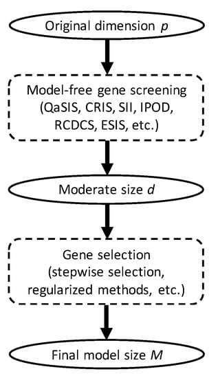 We henceforth refer to our procedure as the ECCFIC-based sure independence screening, or ESIS for short. In practice, common choices of d are , , , and [15,16]. Once the dataset is sufficiently downsized by ESIS, traditional lower dimensional methods can be used afterwards for gene selection and statistical inference (Figure 1). It is noteworthy to point out that ESIS does not impose any model assumptions on the distribution of . The R code to implement the proposed algorithm is available at https://github.com/cke23/GeneScreeningDemo1 (accessed on 30 September 2022).