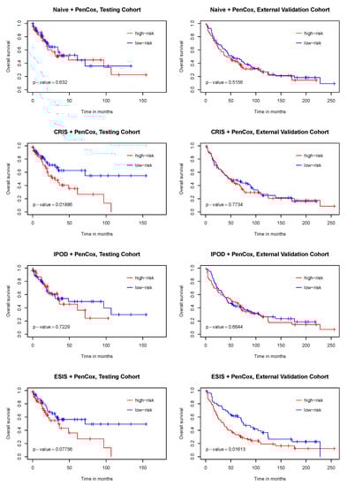 Kaplan–Meier curves of overall survival for test (TCGA) and validation (GEO) cohorts varying with the risk level determined by the four competing models. p-values were obtained from the log-rank tests contrasting the two risk groups.