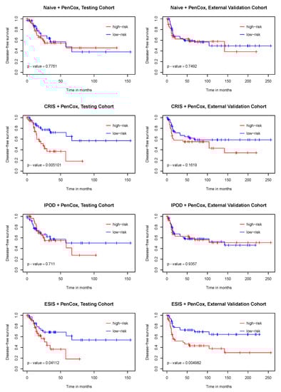 Kaplan–Meier curves of disease-free survival for test (TCGA) and validation (GEO) cohorts varying with the risk level determined by the four competing models. p-values were obtained from the log-rank tests contrasting the two risk groups.