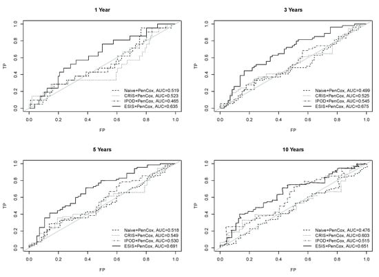 Table 2 lists the influential genes selected by each of the four competing models. All models successfully distinguished the two risk groups for the training data with p-values < 0.001. For the testing samples, the ESIS+PenCox model also led to a separation between the two groups (p-value = 0.078). Patients with a high-risk gene signature had a shorter median overall survival than those with a low-risk gene signature (34.7 months vs. 71.3 months). Moreover, patients with a high-risk gene signature were associated with a shorter disease-free survival than patients with a low-risk gene signature (29.7 months vs. not reached for median survival, p-value = 0.041). The same observation held for the subgroup of patients with metastasis (34.4 months vs. not reached for median disease-free survival; p-value = 0.010). For the external validation samples, the ESIS+PenCox provided the best stratification among the four models in terms of overall survival (p-value = 0.016) and disease-free survival (p-value = 0.005 for all patients and p-value = 0.083 for patients with metastasis). The prognostic indices based on the genes selected by the other screening methods were less informative, leading to insignificant discrepancies between the two risks groups in the validation data. The PenCox model with naive screening suffered from the high dimensionality (700 genes) and failed to predict overall survival and disease-free survival effectively. Figure 2 shows the overall survival curves for high-and-low risk groups in the testing and external validation cohorts, while results for disease-free survival are presented in Figure 3. Figure 4 displays the ROC curves at 1, 3, 5 and 10 years for the competing models on the external validation data. The results also suggest that the ESIS+PenCox model provided the best predictions.