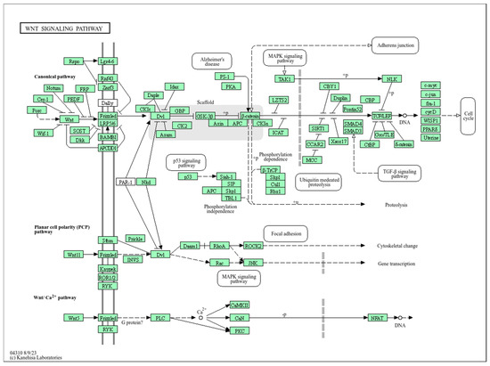 Figure 2. Wnt signaling pathway from KEGG, https://www.genome.jp/pathway/hsa04310 accessed on 30 July 2024 [46].