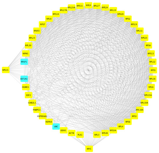 Figure 5. The Gibbs homology network for a patient in which RPS15 has the highest Betti centrality. RPS15 and MYC are pulled out for easy location. MYC and all of its first neighbors are highlighted in yellow.