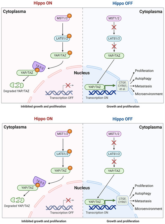 Under physiological conditions, the Hippo signaling pathway maintains a dynamic balance between cell proliferation and apoptosis. This balance regulates the development and maturation of tissues and organs, suppresses tumorigenesis, and ensures the stability of the internal environment [21]. The primary function of the Hippo signaling pathway (i.e., MST1/2, LTAS1/2) is to deactivate key effector molecules (YAP/TAZ), thereby rendering the transcription co-factors inactive. This action blocks the expression of genes, such as cyclin E, cyclin D1, β-catenin, AXL receptor tyrosine kinase (AXL), cysteine-rich 61 (CYR61), and connective tissue growth factor (CTGF), which are involved in cell proliferation, adhesion, migration, and invasion [22,23].