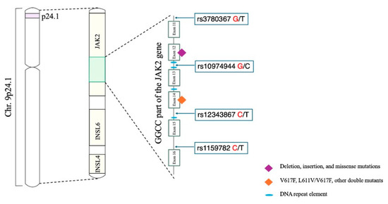 The “GGCC” part includes the JAK2 gene region between intron 10 and intron 15, which is characterized by four single nucleotide polymorphisms (SNPs) that replace three thymidines (T) and one cytosine (C) with two guanosines (G) and two cytosines (rs3780367:G, rs10974944:G, rs12343867:C, and rs1159782:C). All these SNPs are in complete linkage disequilibrium; thus, they are always inherited together [15].