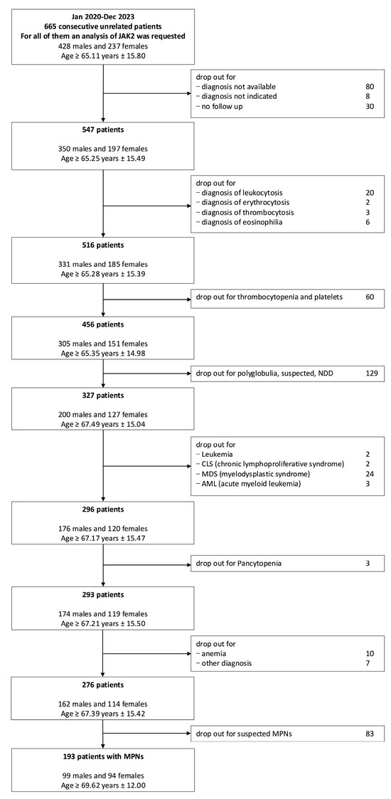 A total of 665 samples were collected by the hematology laboratory at “V. Fazzi” Hospital (LE) from January 2020 to December 2023. These patients were previously diagnosed with the JAK2 V617F mutation. Among them, we selected only patients with a confirmed diagnosis of myeloproliferative syndrome (MPS), while we excluded individuals with no follow up available for many reasons (consultancy, occasional medical examination, patients who have changed hospitals, etc.,) and those with not enough data. Among the 547 remaining patients, we also excluded those with leukocytosis, erythrocytosis, thrombocytosis, and eosinophilia, and patients with thrombocytopenia, different types of polyglobulia, pancytopenia, and anemia were also excluded. Also, patients with leukemia, chronic lymphoproliferative syndrome (CLS), myelodysplastic syndrome (MDS), and acute myeloid leukemia (AML) were removed. As a result, we obtained a corpus of 276 patients. Of these, however, 83 patients had no confirmed diagnosis of MPNs and were excluded. Among the 193 remaining patients, 91 were unclassifiable; thus, only 102 patients with certain diagnosis of MPNs were considered for this study.