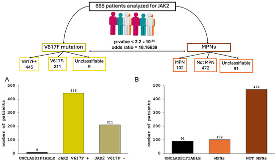(A) This graph shows 665 patients analyzed for JAK2V617F mutation. In yellow, there are patients who tested positive or negative for V617F mutation. Nine samples were not evaluated by molecular analysis and are reported in graph as unclassifiable (i.e., poorly celluled sample, low concentration of extracted DNA that become undetectable with multiplex PCR assay). (B) Patients are classified based on the MPN diagnosis. Among the 665 patients analyzed, only 102 are classified as MPNs, thanks to clinical signs and molecular biology tests (orange), while 472 have other diagnoses (dark orange) and 91 are unclassifiable because their diagnosis was not indicated in the medical records. Differences between the groups were tested using the Fisher exact test with R project for statistical computing. p value < 0.01 was set as the threshold for statistical significance.