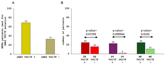 (A) This graph shows 102 patients analyzed for JAK2V617F mutation. In lighter yellow, there are patients who tested positive for V617F mutations, and in darker yellow, those who tested negative, thanks to multiplex PCR analysis. (B) This graph represents the prevalence of JAK2-V617F mutation in patients with MPNs. Red, purple, and green columns represent the prevalence ofV617F mutation in patients with essential thrombocythemia, polycythemia vera and myelofibrosis, respectively. TE: essential thrombocythemia; PV: polycythemia vera; MF: myelofibrosis. Differences between the groups were tested using the Fisher exact test with R project for statistical computing. p value < 0.01 was set as the threshold for statistical significance.